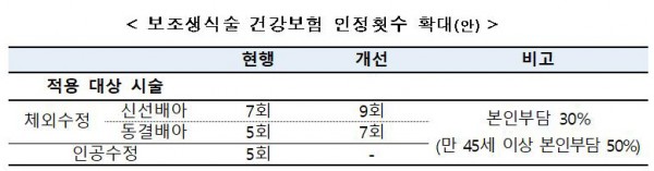 - 이는, 2019년 7월 건강보험 보장성 강화대책 후속조치에 따라 기존의 여성 연령(만 45세 미만) 제한을 폐지하고, 건강보험 인정횟수를 확대*하기로 한 결정에 따라 추진된 사항이다.