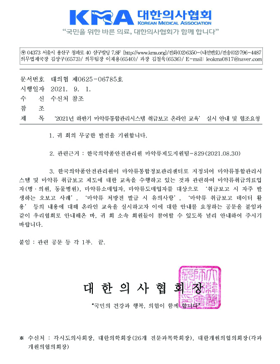 [의협]2021년 하반기 ‘마약류통합관리시스템 취급보고 온라인 교육’ 실시 안내