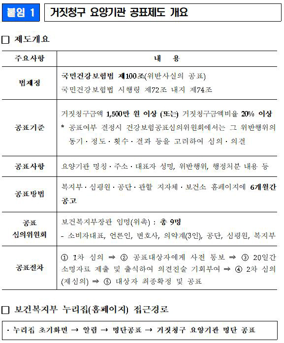 ㅇ (명단공표) 거짓청구금액이 1,500만 원 이상 또는 거짓청구금액 비율이 20% 이상일 경우 복지부, 심평원, 공단 및 해당 지자체 홈페이지 등에 요양기관 명단 공표