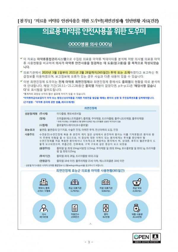 [식약처]의료용 마약류 최면진정제 ‘안전사용 도우미 서한’(졸피뎀, 미다졸람 등 9개 최면진정제 사용통계)