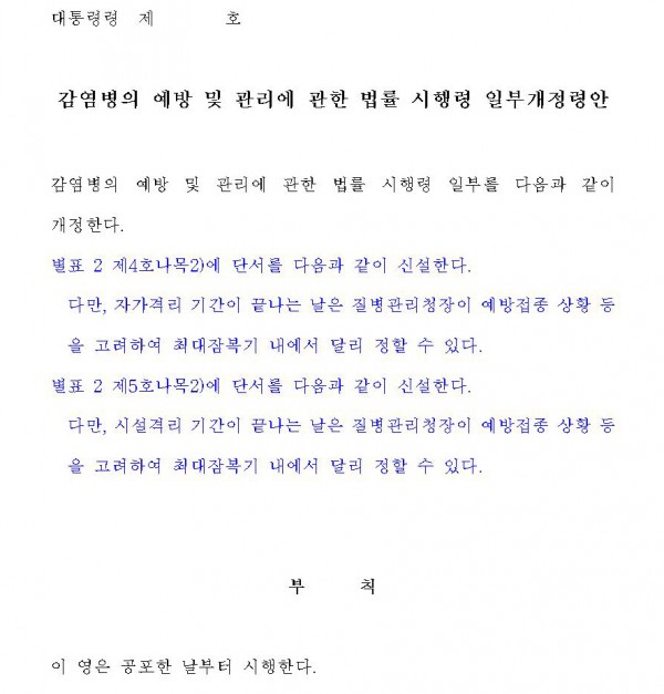 질병관리청 정은경 청장은 “이번 시행령 개정을 통해 일률적으로 정하고 있는 격리기간을 예방접종 상황 등에 따라 달리 정할 수 있는 근거가 마련되었고, 이에 따라 향후 탄력적인 격리기간 운영이 가능하게 되었다”라고 밝혔다.