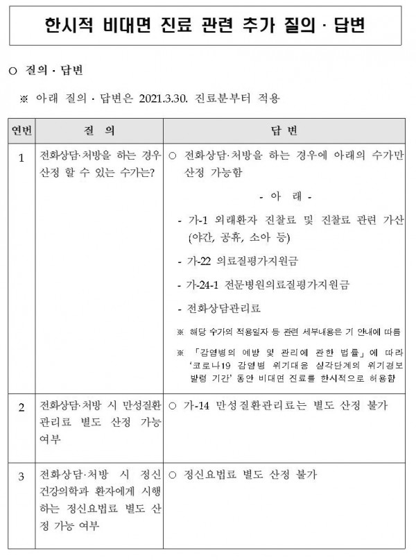[복지부]한시적 비대면 진료 관련 질의응답 추가 안내(전화상담·처방 수가)