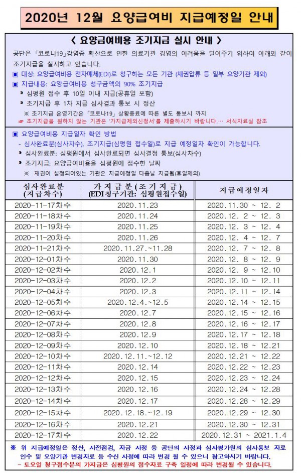 [건보공단]2020년 12월 요양급여비 지급예정일 안내(요양급여비용 조기지급 실시)