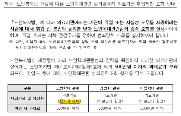 [노무]노인복지법 개정에 따른 '노인학대관련 범죄경력자 의료기관 취업제한' 조회 안내