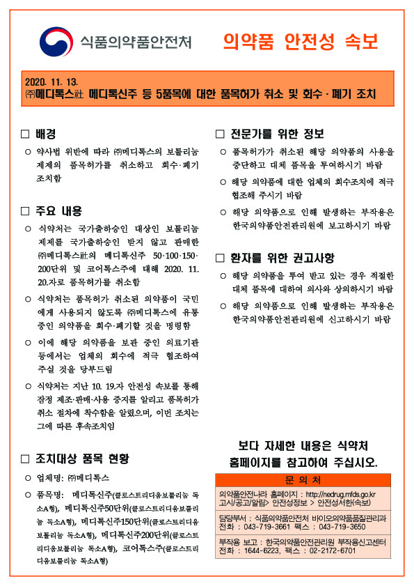 한편, 식약처는 품목허가가 취소된 의약품이 사용되지 않도록 ㈜메디톡스에 유통 중인 의약품을 회수·폐기할 것을 명령하고, 해당 의약품을 보관 중인 의료기관 등에는 회수에 적극적으로 협조할 것을 당부하였습니다.
