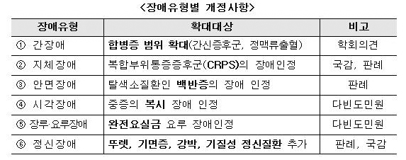 이번 개정안은 그동안 지속적으로 장애인정 필요성이 제기된 질환에 대하여 타 장애와의 형평성 및 객관적 판정기준 유무 등을 고려하여 장애인정기준을 신설하는 등 장애정도 심사제도를 개선하기 위해 마련되었다.