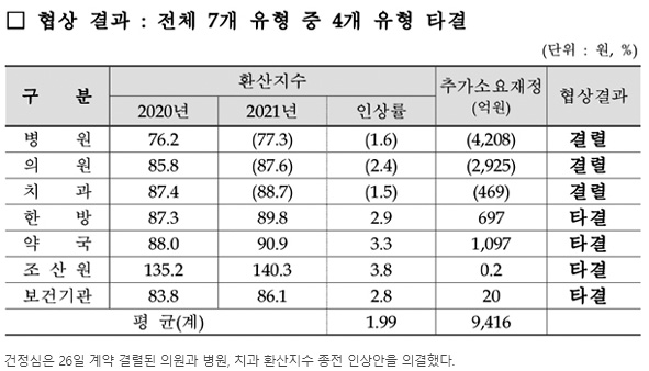 지난 5월 요양급여비용 협상 시 결렬된 병원․의원․치과 유형에 대한 2021년도 환산지수 인상률을 심의한 결과 병원은 1.6%, 의원은 2.4%, 치과는 1.5% 인상하기로 최종 결정하였다.
