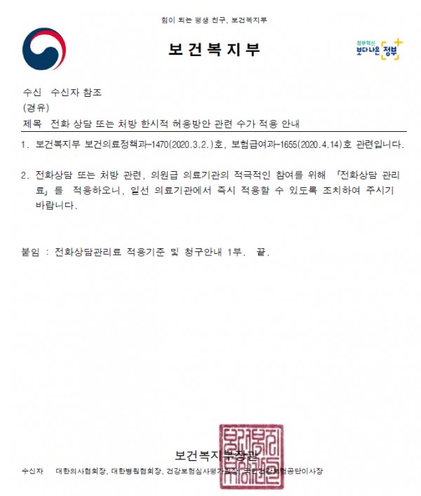 [복지부]전화 상담 또는 처방 한시적 허용방안 관련 수가 적용 안내