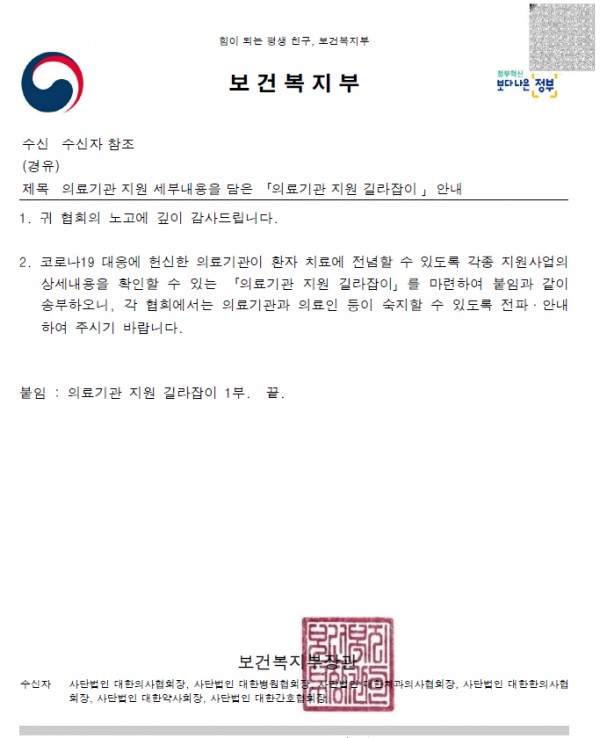 보건복지부에서는 코로나19 대응에 헌신한 의료기관이 환자진료에 전념할 수 있도록 지원사업의 상세내용을 확인할 수 있는 「의료기관 지원 길라잡이」를 마련하여 공지 하였습니다.