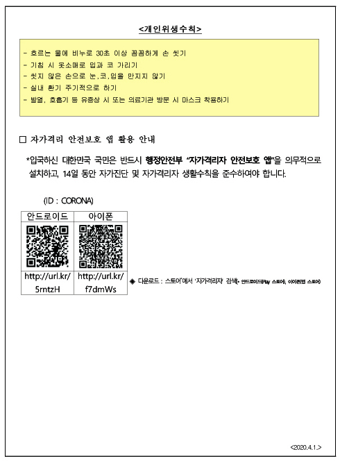 격리 대상자를 위한 주의사항 안내문 대피연 메일보내기 이름으로 검색 0 11,872 2020.04.06 13:53 첨부파일 - 첨부파일: 격리 대상자를 위한 주의사항안내문.pdf (195.7K) 113 - 첨부파일: 격리 대상자를 위한 주의사항안내문1.jpg (1.1M) 166 - 첨부파일: 격리 대상자를 위한 주의사항안내문2.jpg (743.0K) 130 짧은주소 - 짧은주소: https://laserpro.or.kr:443/bbs/?t=64n 주소복사 × 짧은 글주소 복사 Note! 위 주소를 드래그, 복사(Ctrl+C)하여 사용하세요. 이전글다음글 목록 본문 격리 대상자를 위한 주의사항 안내문 이전글다음글 목록 댓글목록 등록된 댓글이 없습니다.