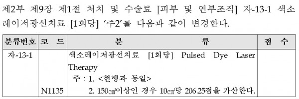 [보험]Pulsed Dye Laser (색소레이저광선치료) 고시 개정(150cm2 이상인 경우 10cm2 당 가산)