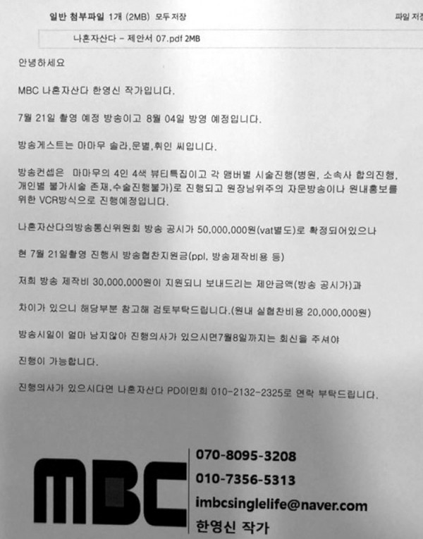 최근 사진 1과 같이 나혼자 산다 제작진을 사칭하여 협찬을 요구하는 메일이 피부과·성형외과 등을 상대로 돌고 있다고 합니다.