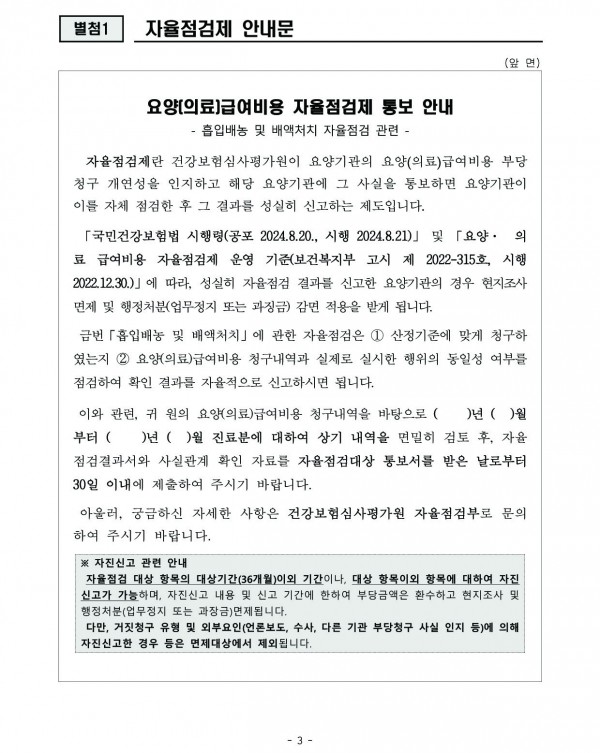 3. 이와 관련, 「흡입배농 및 배액처치 산정기준 위반(2차)」 자율점검을 아래와 같이 실시하오니 홍보 및 안내 등 적극 협조하여 주시기 바랍니다.