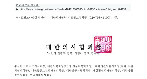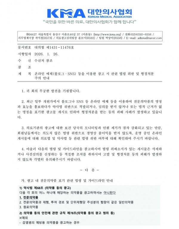 [의협]온라인 매체(블로그·SNS) 등을 이용한 광고 시 관련 법령 위반 및 행정처분 주의 안내 대피연 메일보내기 이름으로 검색 0 11 2026.01.29 10:02 첨부파일 - 첨부파일: 260126[의협]온라인 매체 등을 이용한 광고시 관련 법령 위반 및 행정처분 주의 안내.pdf (162.2K) 0 - 첨부파일: 260126[의협]온라인 매체 등을 이용한 광고시 관련 법령 위반 및 행정처분 주의 안내1 복사.jpg (1.3M) 0 - 첨부파일: 260126[의협]온라인 매체 등을 이용한 광고시 관련 법령 위반 및 행정처분 주의 안내2 복사.jpg (1.6M) 0 - 첨부파일: 260126[의협]온라인 매체 등을 이용한 광고시 관련 법령 위반 및 행정처분 주의 안내3 복사.jpg (831.1K) 0 짧은주소 - 짧은주소: https://laserpro.or.kr:443/bbs/?t=gEc 주소복사 × 짧은 글주소 복사 Note! 위 주소를 드래그, 복사(Ctrl+C)하여 사용하세요. 다음글 목록 본문 [의협]온라인 매체(블로그·SNS) 등을 이용한 광고 시 관련 법령 위반 및 행정처분 주의 안내 다음글 목록 댓글목록 등록된 댓글이 없습니다.