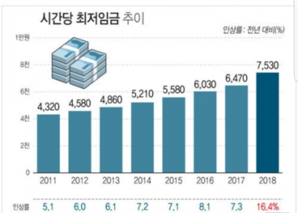 2010년 이후 연도별 최저임금 인상률은 2.75%(2010년), 5.1%(2011년), 6.0%(2012년), 6.1%(2013년), 7.2%(2014년), 7.1%(2015년), 8.1%(2016년), 7.3%(2017년) 등이다.
