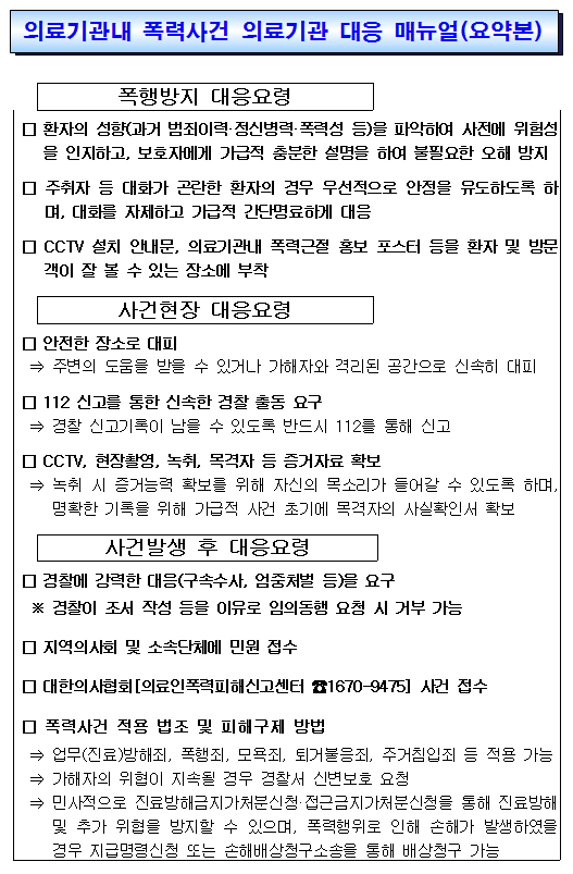 ▷의료기관내 폭력사건 의료기관 대응 매뉴얼(요약본)