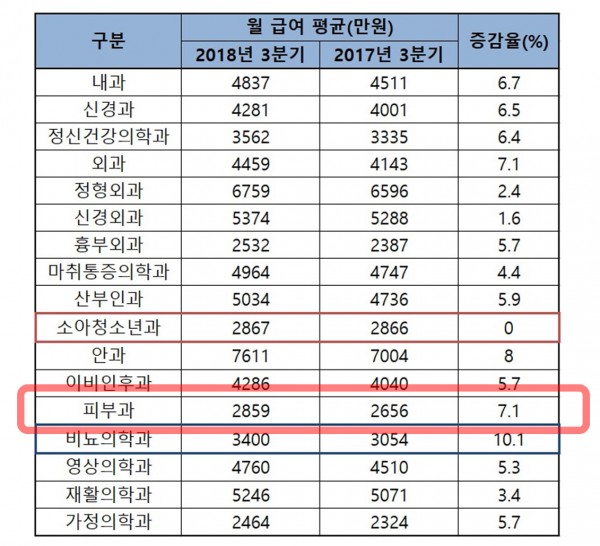 심평원 2018년 3분기 진료비통계지표 (피부과 월 급여 2,859만원, 전년 대비 7.1% 증가)