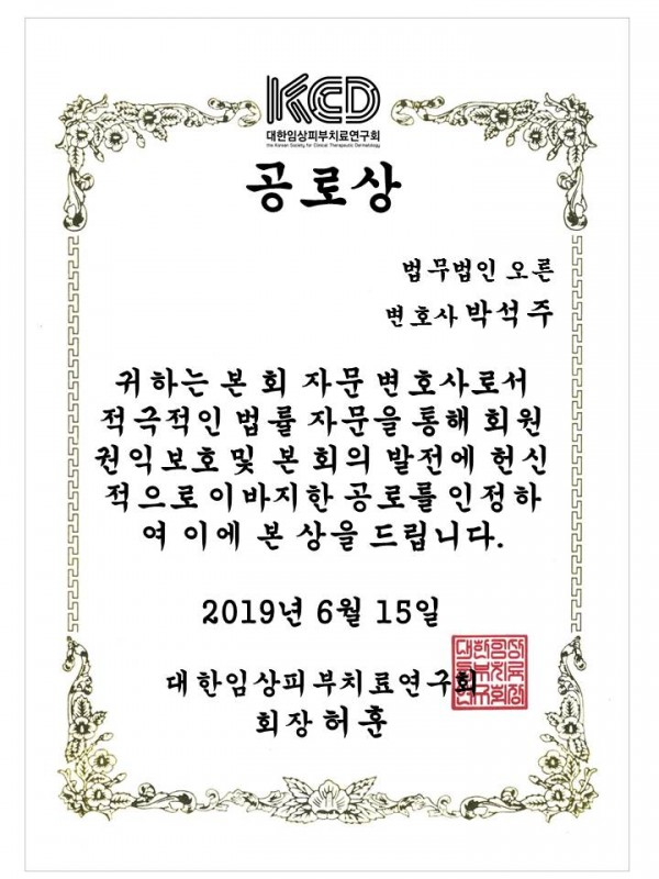 본 회 박석주 법률자문위원(변호사)이 최근 복지부 실사 등 ‘대피연119’를 통해 들어온 회원들의 긴급 민원을 적극적으로 효율적으로 대처해 준 공로를 인정받아 대피연 허훈 회장으로부터 공로상을 받았습니다.