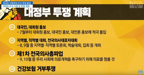 최대집 의협 회장은 2일 청와대 앞에서 의료개혁을 위한 대정부 요구 사항을 발표하고, '총파업'을 포함한 강력한 대정부 투쟁 계획을 공개했습니다.