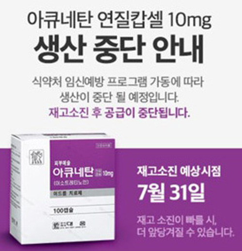 대웅제약은 '아큐네탄 연질캅셀 10mg'의 생산 중단을 결정하고 이같은 내용을 관련업계에 전달했다.