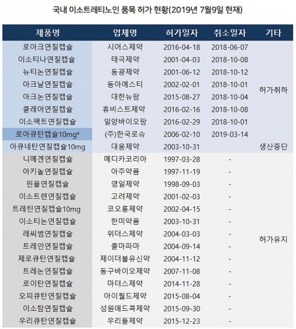 이같은 생산 중단의 배경에는 이소트레티노인 제제를 포함한 `레티노이드계` 의약품의 안전성 이슈와 맞물려 있는 것으로 풀이된다.