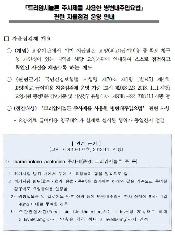 [심평원]트리암시놀론 병변내주입요법 자율점검제 시행 대피연 메일보내기 이름으로 검색 1 14,752 2019.08.16 15:42 첨부파일 - 첨부파일: 심평원.jpg (16.1K) 214 - 첨부파일: 붙임-자율점검 안내문.hwp (103.5K) 194 짧은주소 - 짧은주소: https://www.laserpro.or.kr:443/bbs/?t=4TP 주소복사 × 짧은 글주소 복사 Note! 위 주소를 드래그, 복사(Ctrl+C)하여 사용하세요. 이전글다음글 목록 본문 [심평원]트리암시놀론 병변내주입요법 자율점검제 시행 건강보험심사평가원에서는 2018. 11. 1. 부터 현지조사의 사전 예방적 기능 강화를 위한 「요양·의료급여비용 자율점검제(보건복지부 고시 제2018-233호)」가 도입되어 시행 중입니다.이에, 착오청구 개연성이 높은 「트리암시놀론 주사제 사용한 병변내주입요법」과 관련하여 자율점검제를 시행한다고 합니다.2019. 8. 19. 해당 요양기관에 관련 사항을 별도 통보 예정 이라고 합니다. ▷붙임-자율점검 안내문▷(관련 문의) 건강보험심사평가원 자율점검부 : 033-739-1358 이전글다음글 목록 댓글목록 대피연님의 댓글 대피연 메일보내기 이름으로 검색 2019.08.16 15:44 ▷심평원 자율점검 통보서와 관련하여 안내 드립니다 http://www.laserpro.or.kr/bbs/?t=4H5 ▷심평원 자율점검 통보서와 관련하여 안내 드립니다 http://www.laserpro.or.kr/bbs/?t=4H5