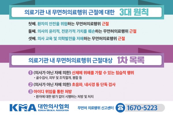 대한의사협회에서는 그동안 의료기관 내 무면허 의료행위근절을 위한 특별위원회를 운영하며 다음과 같이 의료기관 내 무면허의료행위 근절에 대한 3대 원칙 및 무면허의료행위 근절대상 1차 목록을 마련하였습니다.