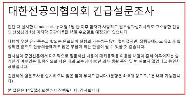 인턴 때 실시한 femoral artery 채혈 1달 반 이후 환자가 사망하고 업무상과실치사죄로 고소당한 전공의 선생님의 1심 마지막 공판이 5월 15일 수요일로 예정되어 있습니다.