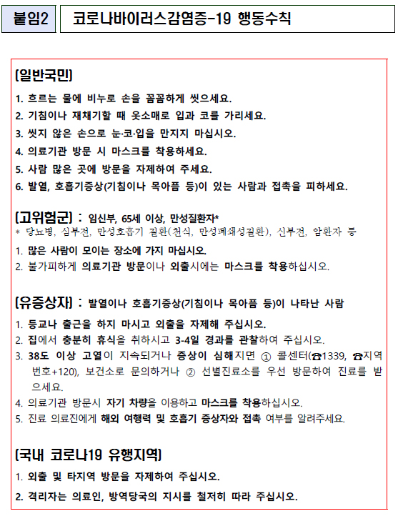 1. 외출 및 타지역 방문을 자제하여 주십시오.