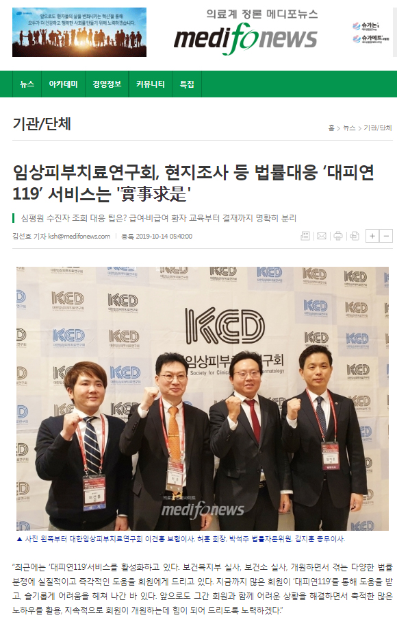 [메디포뉴스]대한임상피부치료연구회, 현지조사 등 법률대응 ‘대피연119’ 서비스는 '實事求是'