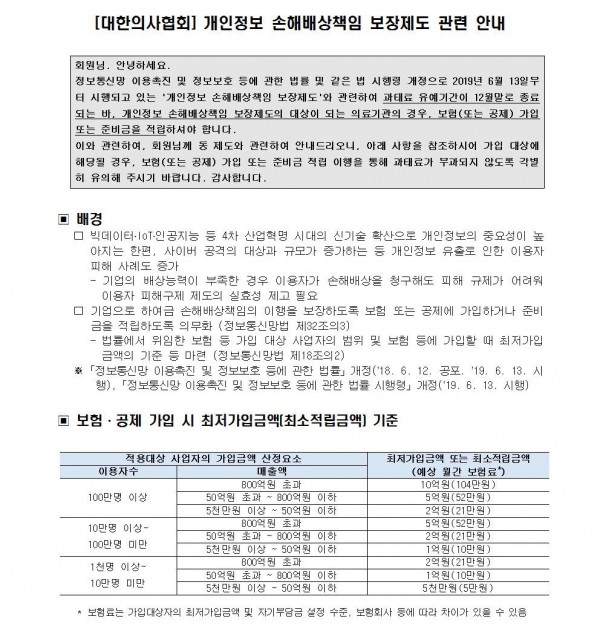 정보통신망 이용촉진 및 정보보호 등에 관한 법률 및 같은 법 시행령 개정으로 2019년 6월 13일부터 시행되고 있는 '개인정보 손해배상책임 보장제도'와 관련하여 과태료 유예기간이 12월말로 종료되는 바, 개인정보 손해배상책임 보장제도의 대상이 되는 의료기관의 경우, 보험(또는 공제) 가입 또는 준비금을 적립하셔야 합니다.