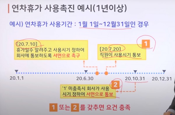 1. 최초 1년의 근로기간이 끝나기 3개월 전을 기준으로 10일 이내에 사용자가 근로자별로 사용하지 아니한 휴가 일수를 알려주고, 근로자가 그 사용 시기를 정하여 사용자에게 통보하도록 서면으로 촉구할 것. 다만, 사용자가 서면 촉구한 후 발생한 휴가에 대해서는 최초 1년의 근로기간이 끝나기 1개월 전을 기준으로 5일 이내에 촉구하여야 한다.