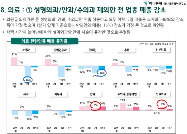 성형외과의 상황은 조금 다르다. 2월 매출은 -0.1%로 다소 떨어졌지만, 3월에는 전년비 9%로 성장세를 보였다. 연구소는 코로나19로 재택시간이 길어지면서, 이 기간 성형외과 시술을 받은 사람이 늘어난 것으로 분석했다.