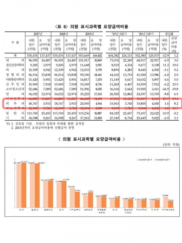 [심평원]2020년 3분기 진료비 주요통계(피부과 8.2% 증가, 건당진료비 25,590 원)