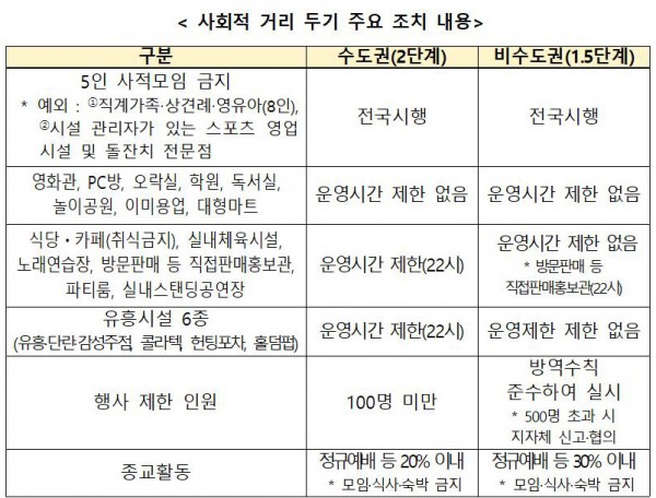 5인 이상 사적 모임 금지 조치를 유지하고, 집단감염 사례 등을 통해 일부 미비점이 나타난 부분에 대한 방역 조치를 보완한다.