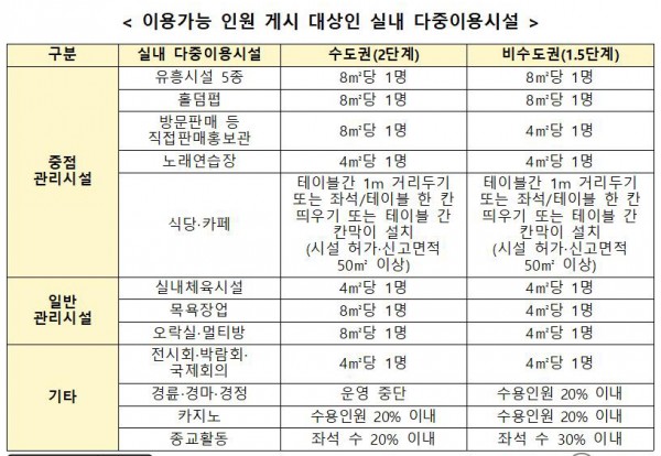 - 사전 등록‧예약제 등으로 운영되어 인원 게시 필요가 없는 시설 등은 대상에서 제외하고, 불특정 다수가 입장하여 밀집도 관리가 필요한 시설은 추가하는 등 조정하였다.