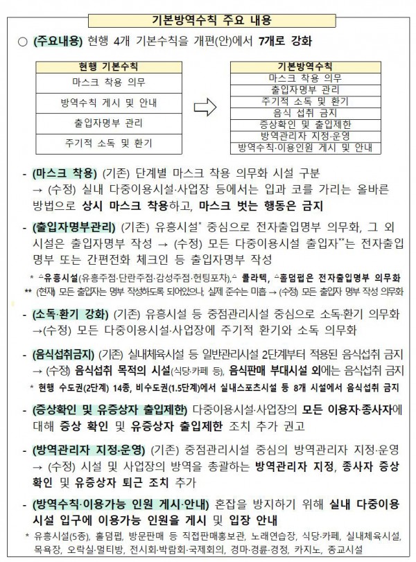기본방역수칙은 기존 4개*의 기본수칙을 7개로 강화하였다.