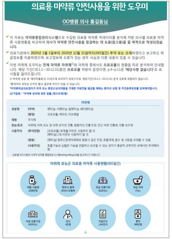 작년까지는 의료용 마약류의 마취제 성분 중 프로포폴 1개 성분에 대해서만 도우미 서한을 제공하였으나 올해부터는 전체 의료용 마약류 마취제 성분* 현황을 분석하여 제공하고