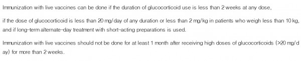간단하게 말하면 스테로이드를 2주일간 복용했다면 약 중단후 1개월후에 예방접종하라는 것입니다.