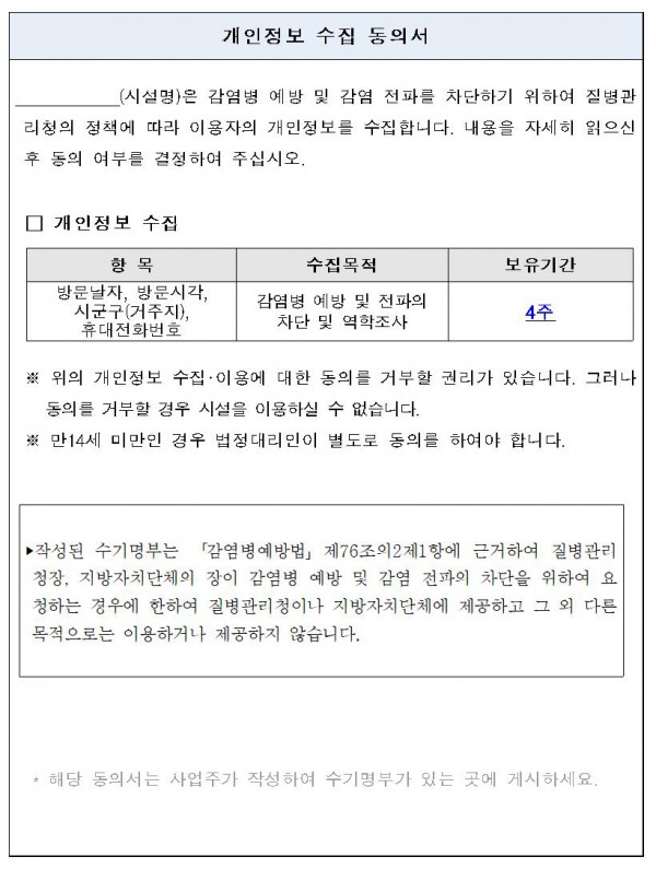 코로나19 방역지침, 출입자수기명부 format