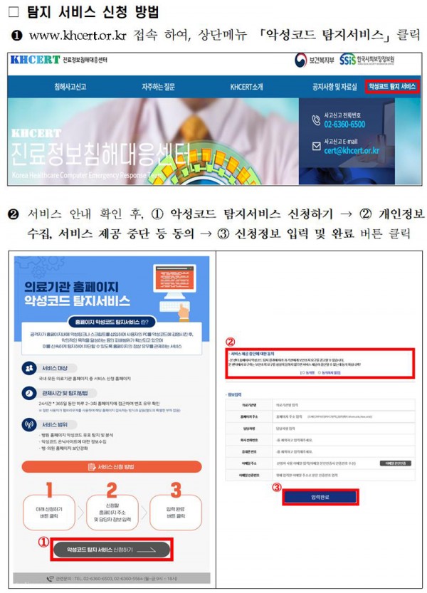 서비스를 희망하는 민간 의료기관은 진료정보침해대응센터 누리집(www.khcert.or.kr)로 신청*하면 2월 1일부터 서비스를 무상으로 제공받을 수 있다.