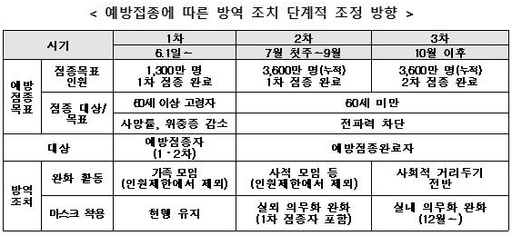 예방접종 계획상 주요 분기점인 7월과 10월을 중심으로 방역조치 조정대상 및 활동을 구분하여 단계적으로 실시한다.