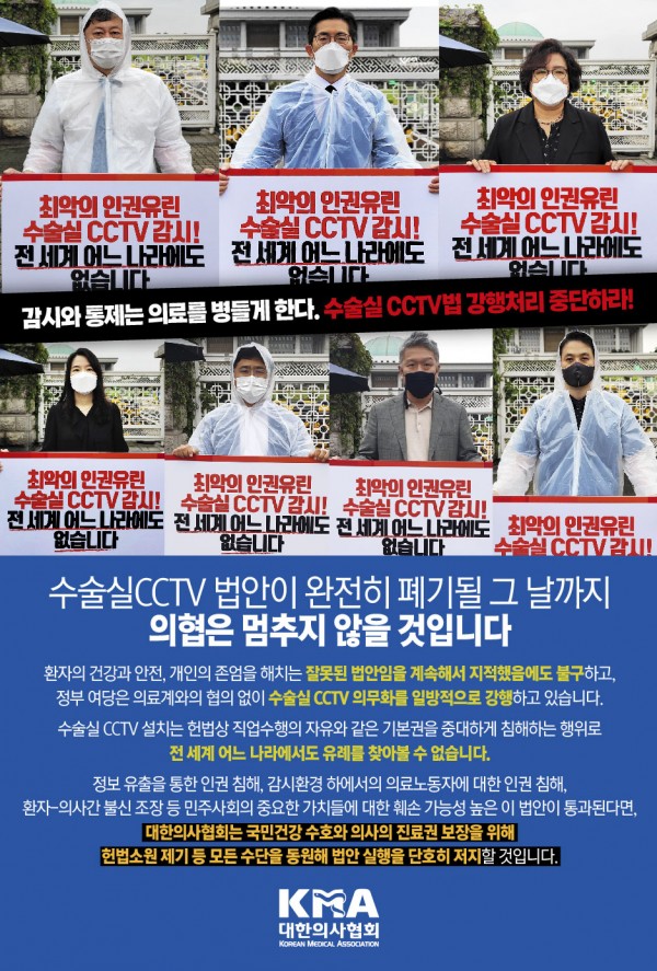 극히 일부 외과계 의사들의 잘못된 행동을 감시하기 위해서 수많은 외과계 의사들의 손목을 묶어 수술이 꼭 필요한 대다수 국민들의 생명에 예상치 못한 결과를 초래할 수술실 CCTV 의무화 법안을 철회하여 주시고 의사들 스스로 자정 노력과 함께 극히 일부 의사의 일탈을 막을 수 있는 다른 대책을 마련하여 주실 것을 간곡히 촉 구합니다. 앞으로 우리 외과계 의사들은 지금까지 환자의 생명을 살리기 위해서 무한히 갈고 닦았던 세계 최고 수준의 의료를 제공하기 위해 더욱 더 노력하겠습니다. 감사합니다.