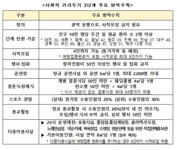 - 예방접종 완료자에 대한 사적모임 예외 적용 확대(4단계 6인, 3단계 8인까지 가능)