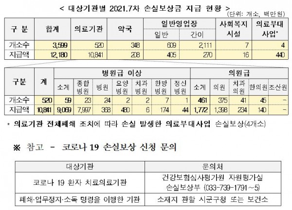 - 폐쇄·업무정지·소독 명령 이행 관련 ’21년 7차 손실보상금은 의료기관(520개소), 약국(348개소), 일반영업장(2,720개소), 사회복지시설(7개소), 의료부대사업(4개소) 등 3,599개 기관에 총 122억 원이 지급된다.