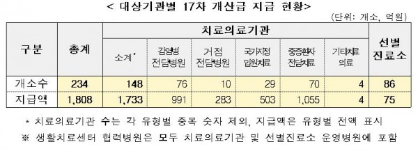 - 이번 개산급(17차)은 234개 의료기관에 총 1,808억 원을 지급하며, 이 중 1,733억 원은 감염병전담병원 등 치료의료기관(148개소)에, 75억 원은 선별진료소 운영병원(86개소)에 각각 지급한다.