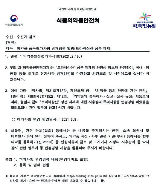 식약처는 2021년 2월 ‘의약품 품목 허가사항 변경명령 알림’을 통하여 트라넥삼산 성분 제제의 허가사항 중 ‘이상반응’에 “동맥 및 정맥 혈전증이 나타날 수 있다”는 내용을 추가하였다고 밝혔고, 이에 따라 허가사항이 변경되어 2021년 6월부터 시행 중에 있습니다.