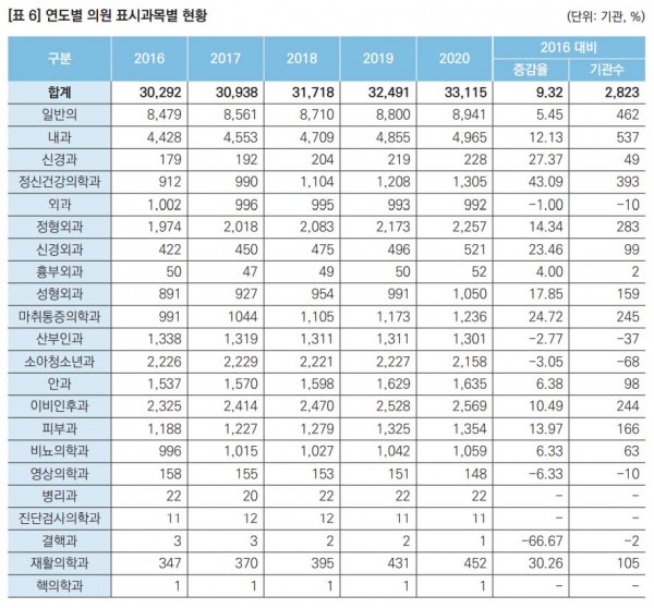 [심평원]보건의료자원 현황 통계 분석(2016년_2020년), 피부과 14% 증가