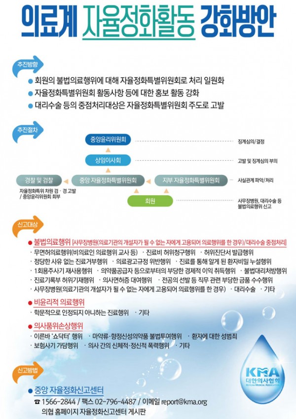 또한 회원의 불법의료행위 등에 대한 신고 및 접수를 자율정화특별위원회로 일원화함으로써 처리의 신속성 및 적정성을 제고하여 자율정화 역량을 더욱 강화해 나간다는 방침이다.