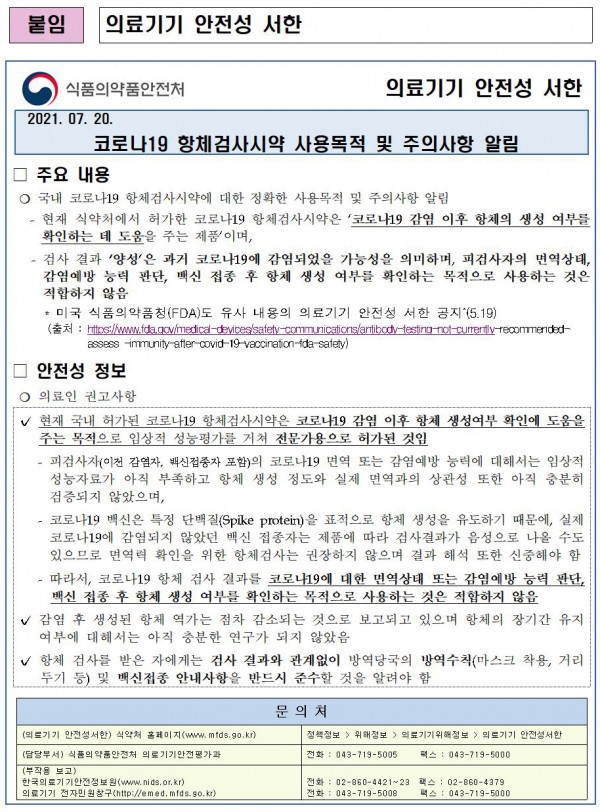 - 항체검사시약 사용목적과 주의사항 관련 안전성 서한 배포